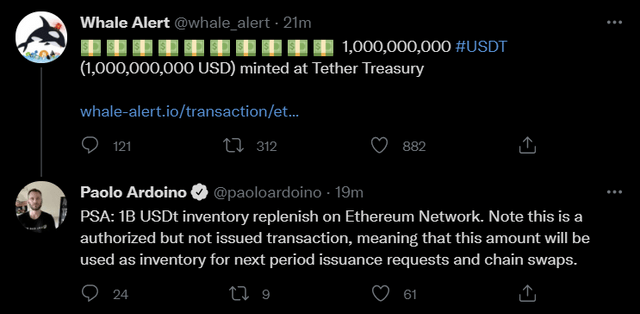 테더, 이더리움 네트워크에 10억개 USDT 재고 보충수정 오전 10:47 · 2021. 08. 20.입력 오전 10:45 · 2021. 08. 20.기사출처양한나 기자00공유하기링크 복사텔레그램엑스카카오톡20일 테더의 최고기술책임자(CTO)인 파올로 아도이노(Paolo Ardoino)가 이더리움 네트워크에 10억개의 USDT가 추가된 것에 대해 "미발행처리분으로, 향후 고객의 발행 요청이나 체인 스왑을 위한 물량"이라고 밝혔다. 웨일알러트에 따르면 이날 23시 20분 테더는 이더리움 네트워크에 10억개의 USDT 재고를 보충했다. ETH양한나 기자sheep@bloomingbit.io안녕하세요 블루밍비트 기자입니다.