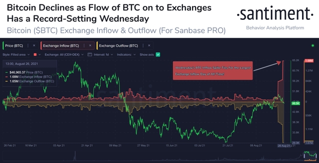 지난 25일 약 168만 비트코인(BTC)이 가상자산(암호화폐) 거래소로 유입되며 2019년 6월 19일 이후 최고치를 기록한 것으로 나타났다.