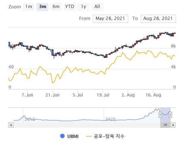 두나무는 '탐욕' 단계에 대해 현재 지수가 점진적으로 상승하고 있으며 가격의 변동성과 거래량이 높아지고 있음을 나타낸다고 설명했다. 이는 단기적인 고점이 형성될 수 있음을 의미한다.