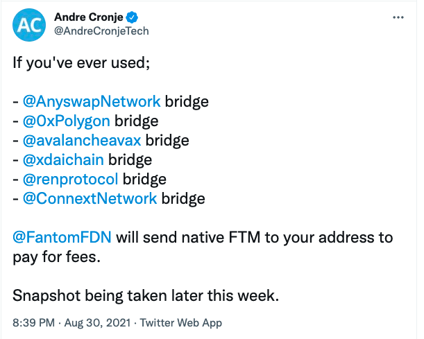 안드레 크로녜(Andre Cronje) 와이언파이낸스(YFI) 창립자는 30일 트위터를 통해 “한 번이라도 애니스왑(ANY) 브릿지, 폴리곤(MATIC) 브릿지, 아발란체(AVAX) 브릿지, 엑스다이(xDAI) 브릿지, 렌(REN) 브릿지, 코넥스트(XCON) 브릿지를 사용한 사용자는 팬텀(FTM) 토큰으로 보상받을 예정”이라고 말했다. 브릿지란 서로 다른 토큰을 맞교환하는 스왑 서비스를 말한다.