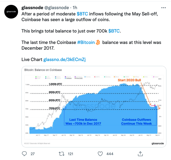 미국 가상자산(암호화폐) 거래소 코인베이스에서 보유한 비트코인(BTC)이 2017년 12월 이후 최저치를 기록하고 있다는 분석이 나왔다.