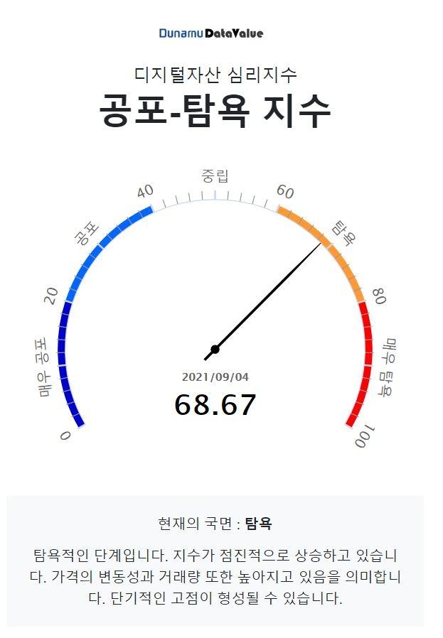 4일 오후 5시 48분 기준 두나무가 제공하는 공포-탐욕지수가 68.67로, '탐욕' 단계를 기록하고 있다.