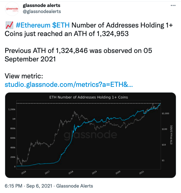 가상자산(암호화폐) 분석 업체 글래스노드는 6일 트위터를 통해 “1이더리움(ETH) 이상 보유한 사용자의 지갑 수가 132만4953개를 기록하며 역대 최고치를 경신했다”고 밝혔다.