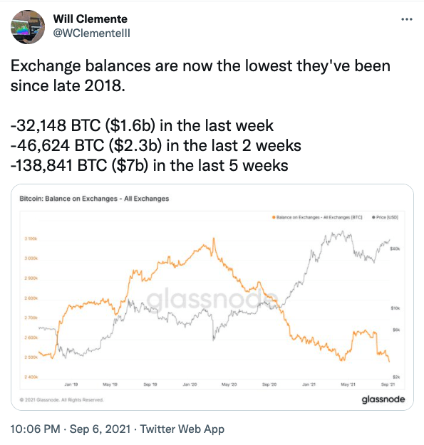 윌 클레멘테 블록웨어솔루션스 분석가는 6일 트위터를 통해 “가상자산 거래소에서 보유한 비트코인(BTC) 총량은 2018년말 이후 최저치를 경신했다”고 밝혔다.