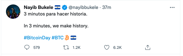나이브 부켈레 엘살바도르 대통령은 이날 트위터를 통해 “비트코인 데이, 우리는 역사를 만들 것”이라고 말했다.