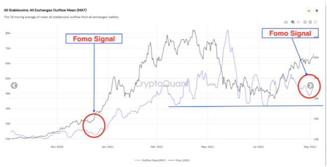가상자산(암호화폐) 분석기업 크립토퀀트가 자체 발행하는 다이제스트(텔레그램)는 7일 “가상자산 거래소에서 최근 7일간 스테이블 코인 유입량이 급증했다. 투자자의 포모(FOMO) 신호로 보인다”고 분석했다.