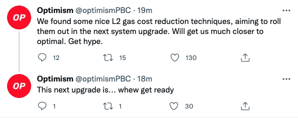 옵티미즘은 7일 트위터를 통해 “이더리움에서 레이어2 솔루션을 사용해 수수료를 더욱 절감할 방법을 찾아냈다. 다음 업데이트에 포함할 예정”이라고 밝혔다.