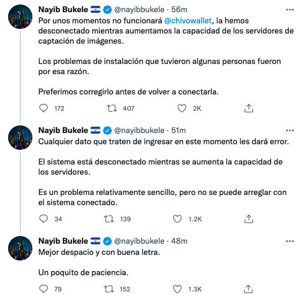 나이브 부켈레 엘살바도르 대통령은 이날 트위터를 통해 “현재 치보 지갑이 오작동하고 있으며 일부 사람들은 설치하는데 문제가 발생하고 있다. 해당 문제는 곧 처리될 것이니 조금만 기다려달라”고 말했다.