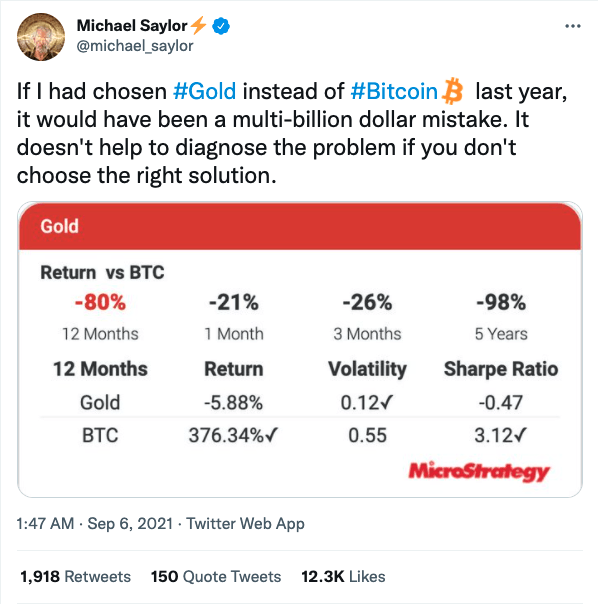 마이클 세일러 마이크로스트레티지 최고경영자(CEO)는 지난 6일 트위터를 통해 “만약 내가 작년에 비트코인 대신 금을 투자하기로 결정했다면 그것은 수십억 달러 규모의 실수였을 것이다”라고 말했다.