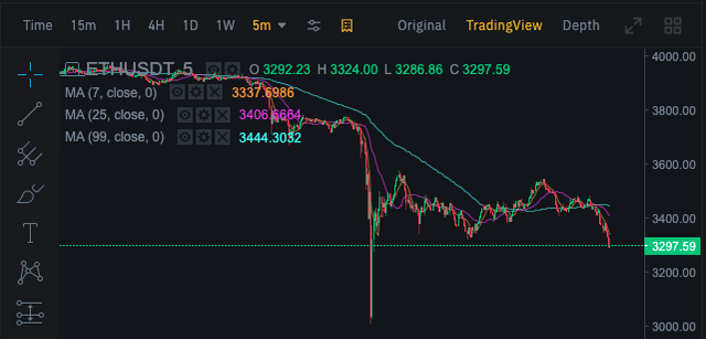 ETH 가격은 8일 15시 53분 바이낸스 거래소를 기준으로 전일 대비 15.8% 하락한 3292달러에 거래되고 있다.