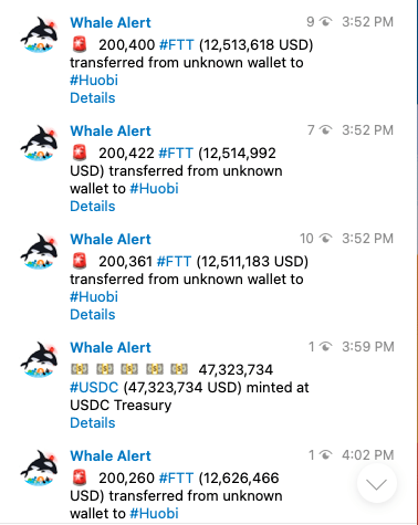가상자산(암호화폐) 고래를 추적하는 웨일얼럿 서비스에 따르면 한국시간 8일 15시 52분경 한 익명 지갑 주소에서 후오비 거래소로 95만1758FTX토큰(FTT)이 이체됐다. 전송된 FTT는 총 5964만달러(약695억원) 규모다.