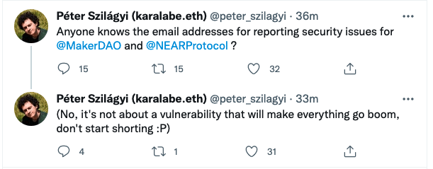 실라지는 8일 트위터를 통해 “메이커다오, 니어프로토콜 보안 취약점을 제보하기 위한 주소를 알려달라”고 말했다.