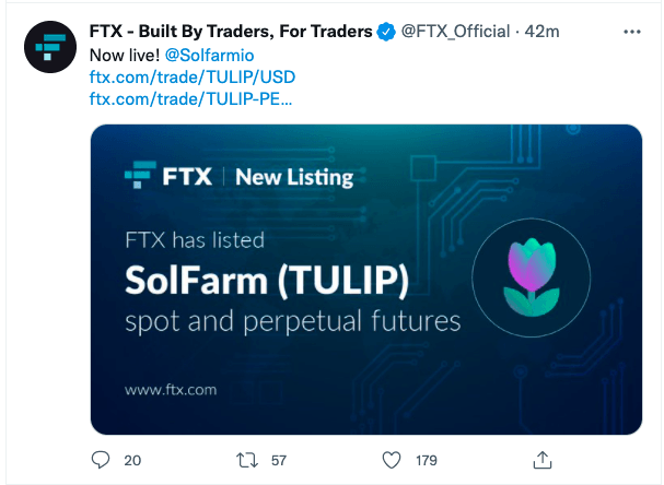 FTX 거래소는 8일 트위터를 통해 솔팜(TULIP·시빅(CVC)의 무기한 선물 계약 및 현물을 상장했다고 공지했다. 거래소는 해당 토큰 입출금 지원 일정 등은 구체적으로 밝히지 않았다.