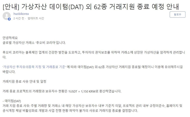 10일 후오비 코리아는 공식 채널을 통해 데이텀(DAT), 나노코인(NANO), 스위프트코인(SWFTC) 등 코인 62종의 거래 지원을 종료한다고 공지했다.