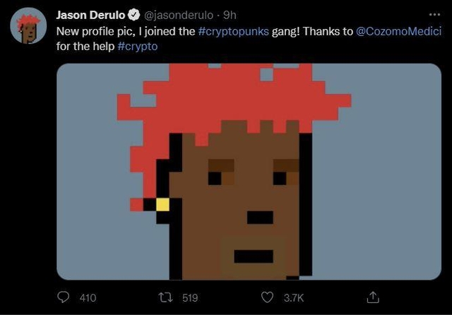 미국 유명 가수 제이슨 데룰로(Jason Derulo)가 크립토펑크 NFT를 구매하며 NFT 열풍에 합류했다.
