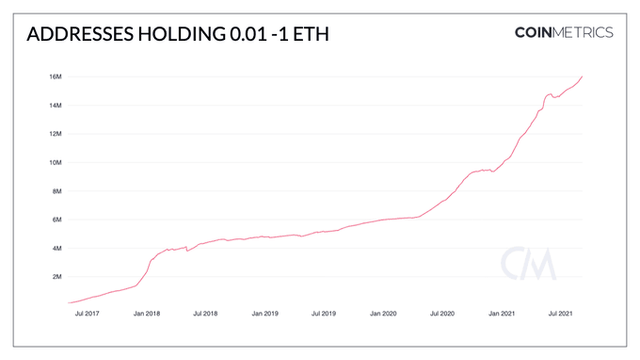 "0.01~1 이더리움(ETH) 보유 지갑, 올 들어 620만개 이상 증가"입력 오전 10:05 · 2021. 09. 10.기사출처양한나 기자00공유하기링크 복사텔레그램엑스카카오톡10일 가상자산(암호화폐) 분석 업체 코인메트릭스 트위터에 따르면 0.01~1 이더리움(ETH) 보유 지갑이 올해 초부터 현재까지 약 620만개 이상 증가한 것으로 나타났다. 코인메트릭스는 "사용자들의 이더리움의 채택이 급증하고 있으며 최근의 가격 하락은 펀더멘털에 큰 영향을 미치지 않는다"고 설명했다. ETH양한나 기자sheep@bloomingbit.io안녕하세요 블루밍비트 기자입니다.