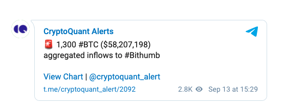 가상자산 분석업체인 크립토퀀트 알람에 따르면 1300BTC(약684억원)이 13일 15시 30분경 빗썸 거래소로 입금됐다.