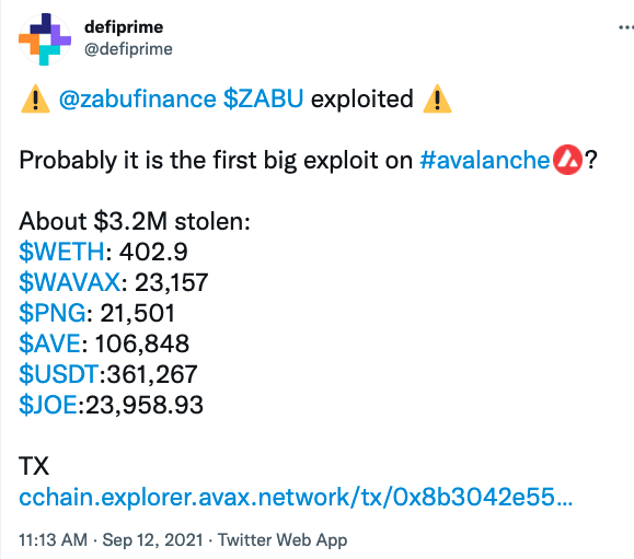 디파이 분석 업체 디파이 프라임은 13일 트위터를 통해 “자부 파이낸스가 공격당했고 320만달러 규모로 자금을 갈취당했다. 아발란체 체인에서 발생한 가장 큰 피해 사고로 추정된다”고 밝혔다.