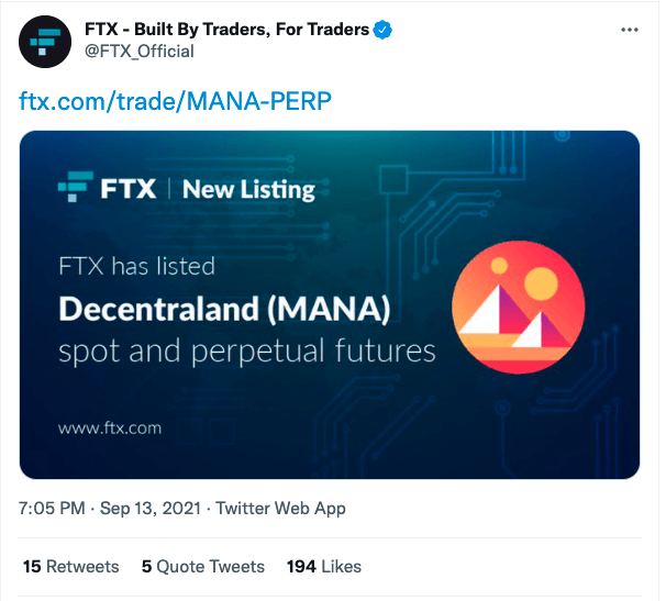 FTX 거래소는 13일 트위터를 통해 디센트럴랜드(MANA)의 무기한 선물 계약 및 현물을 상장했다고 공지했다. 거래소는 해당 토큰 입출금 지원 일정 등은 구체적으로 밝히지 않았다.