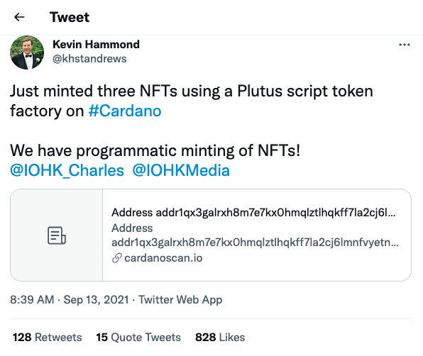 케빈 하몬드(Kevin Hammond) IOHK 개발자는 이날 트위터를 통해 “카르다노의 스마트컨트랙트 개발 언어인 플루투스(plutus)를 사용해 3개의 NFT를 발행했다”고 밝혔다. 이는 ADA 블록체인에서 발행된 최초의 NFT인 셈이다.