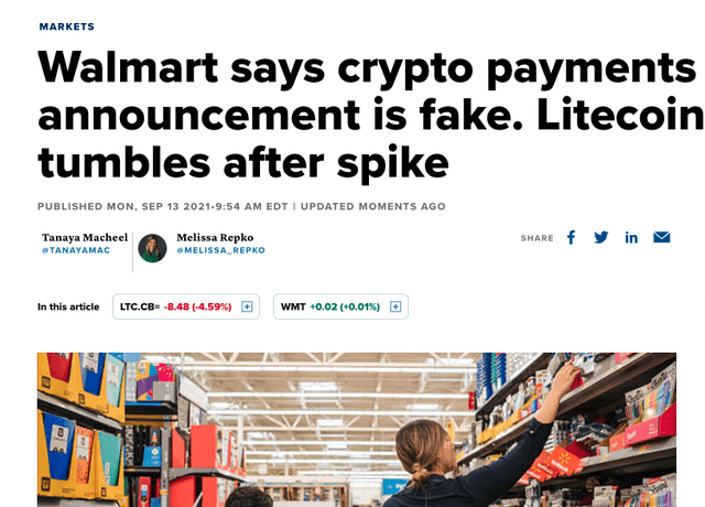 미국 경제 전문 미디어 CNBC는 13일 글로브뉴스와이어가 낸 월마트의 라이트코인(LTC) 결제 지원 소식은 거짓이라고 보도했다.
