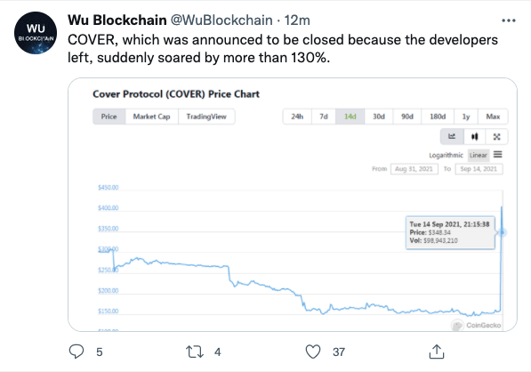 14일 중국 가상자산(암호화폐) 미디어 우블록체인(WuBlockchain)에 따르면 탈중앙화금융(디파이) 보험 프로토콜인 커버 프로토콜(COVER)이 서비스를 중단한다고 발표한 이후로 토큰 가격이 100% 이상 급등하고 있다.