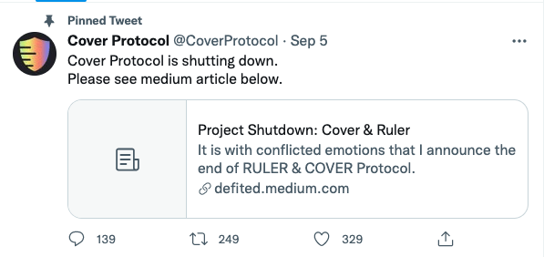 앞서 지난 5일 커버 프로토콜은 “우리는 서비스를 영구 종료한다. (사용자) 보상급 지급은 연파이낸스가 도울 것”이라고 밝힌 바 있다.