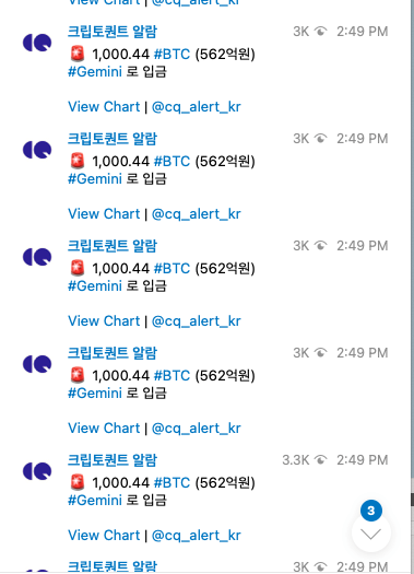 크립토퀀트는 이날 15시 38분경 "비트파이넥스에서 제미니 거래소로 1000BTC이 전송됐고 서버 오류로 알람이 여러번 발생했다. 현재는 삭제한 상태"라고 밝혔다.