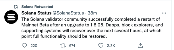 SOL 블록 데이터를 추적하는 솔라나 스테이터스는 15일 트위터를 통해 “솔라나의 메인넷베타는 초당 40만건 트랜잭션을 과도하게 처리하다 네트워크 리소스가 부족해졌다”면서 “현재는 메인넷을 업데이트하고 재시작했다. 디앱 등 모든 기능은 몇 시간 내로 정상화될 것”이라고 밝혔다.