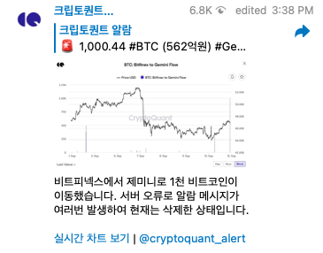 크립토퀀트는 "비트파이넥스에서 제미니 거래소로 1000BTC이 전송됐고 서버 오류로 알람이 여러번 발생했다. 현재는 삭제한 상태"라고 설명했다.
