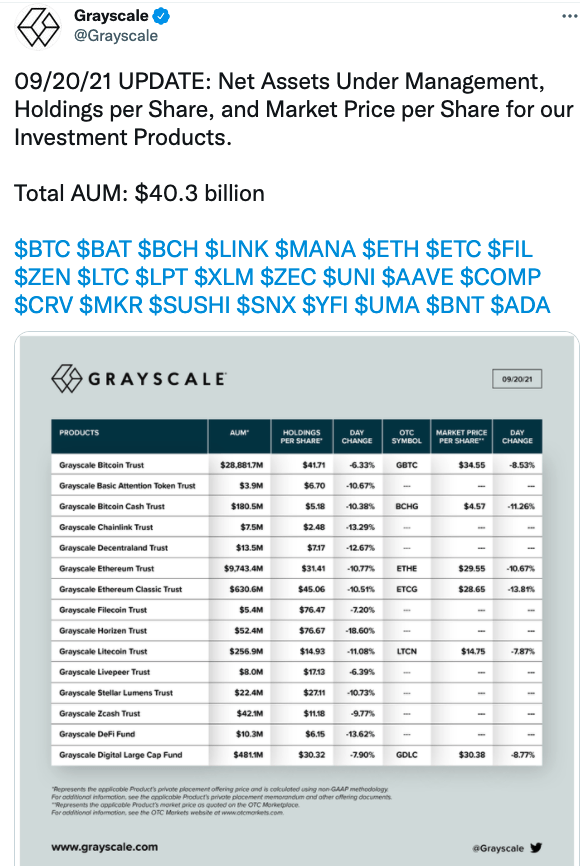 그레이스케일은 21일 트위터를 통해 현재 비트코인(BTC) 288억달러(약34조2400억원)치, 이더리움(ETH) 97억달러(약11조5000억원)치 보유 중이라고 밝혔다. 현재 그레이스케일이 관리 중인 가상자산은 총 403억달러(약47조9100억원) 규모다.