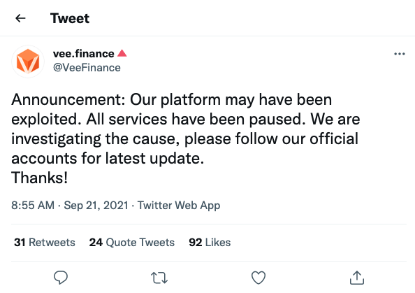 아발란체(AVAX) 탈중앙화금융(디파이) 프로젝트인 비파이낸스(VEE)가 해킹으로 2500만달러(약297억원) 규모 가상자산을 갈취당한 것으로 추정된다.