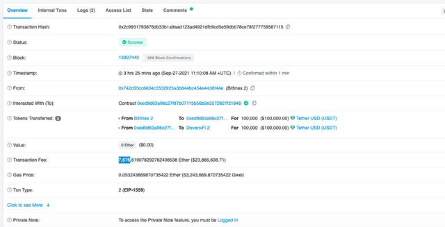 27일 가상자산(암호화폐) 전문 미디어 더블록에 따르면 비트파이넥스 거래소에서 10만 테더(USDT)를 이체하는데 수수료로 7676 ETH(2370만달러 상당)가 지불된 것으로 나타났다.