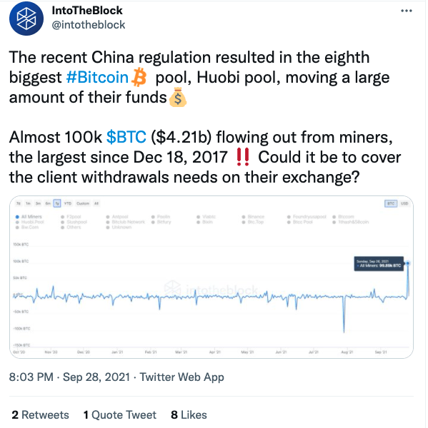 가상자산(암호화폐) 데이터 분석업체 인투더블록은 28일 트위터를 통해 "후오비 비트코인(BTC) 채굴풀에서 10만 BTC(42억1000만 달러 상당)가 전송됐다"며 "거래소에서 (중국) 고객의 가상자산 출금을 지원하기 위한 움직임으로 보인다"고 밝혔다.