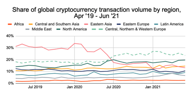 가상자산 분석업체 체이널리시스는 28일 공식 블로그를 통해 "지난 1년 동안 CNWE 지역에서 가상자산이 1조 달러 규모로 거래됐다"며 "이는 전세계 가상자산 거래 활동의 25%를 차지한다"고 분석했다. 동아시아에서 가상자산 거래량이 감소하면서 상대적으로 유럽의 가상자산 시장이 주목받고 있다는 설명이다.