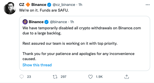 장펑 자오 바이낸스 최고경영자(CEO)는 자신의 트위터를 통해 "우리는 해당 문제를 해결하고 있다. 자금은 안전하다"고 밝혔다.
