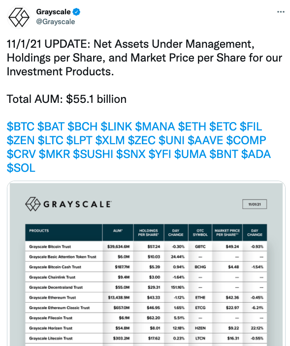 현재 그레이스케일은 비트코인(BTC) 396억34000만달러치, 이더리움(ETH)을 134억38000만달러, 체인링크(LINK) 940만달러, 베이직어텐션토큰(BAT) 600만달러, 파일코인(FIL) 610만달러치 보유하고 있다.
