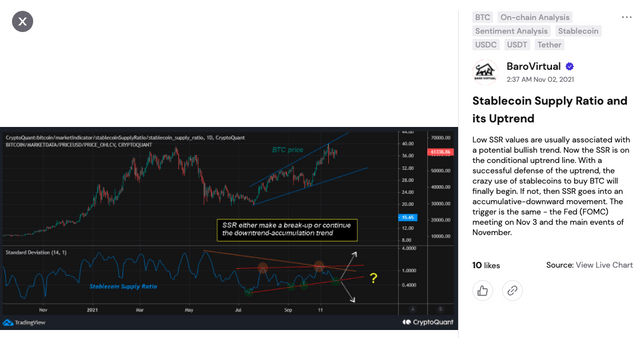 일반적으로 SSR의 하락은 비트코인에 비해 스테이블코인의 공급량이 더욱 큰 폭으로 늘어나고 있으며 구매력이 증가하고 있음을 의미한다.