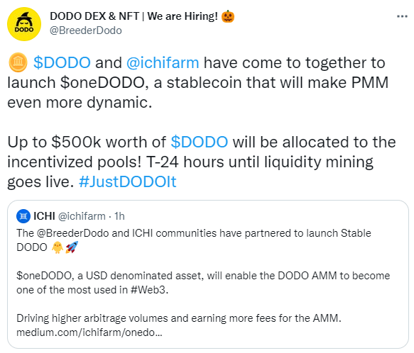 2일 탈중앙화 가상자산(암호화폐) 거래소 도도(DODO)가 공식 트위터를 통해 "ICHI와 협력해 새로운 스테이블코인oneDODO를 출시했다"고 밝혔다.