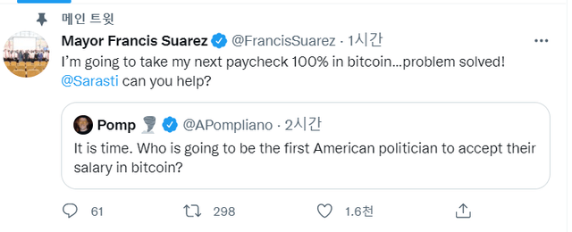 수아레스 마이애미 시장은 '비트코인으로 보수로 받는 최초의 미국 정치인은 누구일까?'라고 묻는 트윗을 리트윗한 것으로 알려졌다.