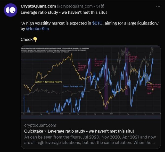 3일 오전 10시 50분경 크립토퀀트는 트위터를 통해 비트코인의 레버리지 비율 데이터를 공유했다. 업체는 "이런 경우를 본 적이 없다"며 "대규모 청산을 목표로 하는 비트코인의 대규모 변동성이 예상된다"고 밝혔다.