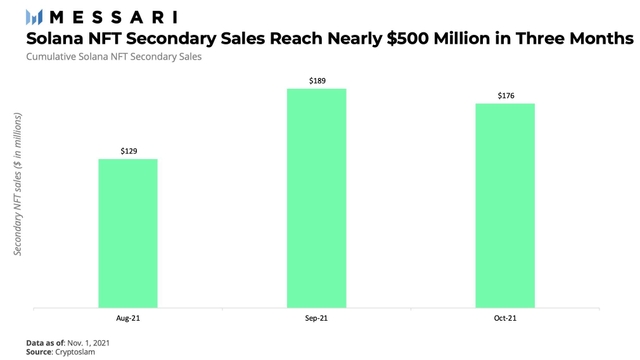 가상자산(암호화폐) 데이터 분석 업체 메사리 소속 애널리스트 메이슨 나이스트롬(Mason Nystrom)은 3일(현지시간) 트위터를 통해 "솔라나(SOL)의 생태계가 계속해서 커지면서 솔라나의 대체불가토큰(NFT) 또한 엄청난 성장을 보이고 있다"며 "솔라나 NFT 2차 판매량이 단 3개월 만에 5억달러(5900억원)에 도달했다"고 밝혔다.