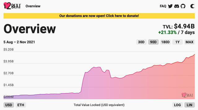 3일 블록체인 데이터 통계 사이트인 엘투비트(l2BEAT)에 따르면 이날 18시 30분 기준 이더리움(ETH)의 레이어2 네트워크에 예치된 총 자산(TVL) 규모가 전주 대비 21.33% 상승해 49억4000만달러를 돌파했다. 이는 약 5조8366억원 규모다.