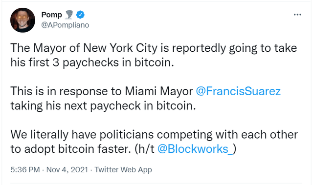 4일 안토니 폼플리아노 모건 크릭 창업자(CEO)가 자신의 트위터를 통해 "뉴욕 시장이 첫 3개월 급여를 비트코인(BTC)으로 받을 예정"이라고 밝혔다.
