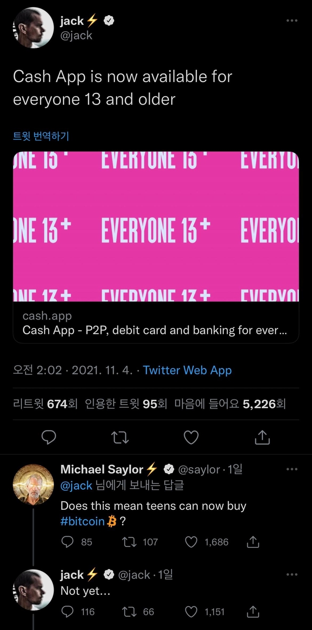 이에 마이클 세일러 마이크로스트레티지 최고경영자(CEO)가 "그럼 십대들도 비트코인(BTC) 거래를 할 수 있다는 뜻인가"라고 답글을 달았고 잭 도시는 "아직"이라고 답변했다.