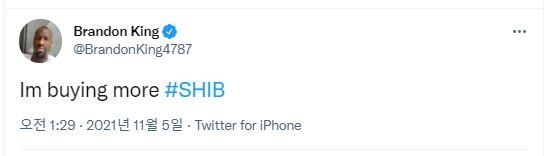 5일 미국 프로미식축구 선수 브랜든 킹(Brandon King)이 자신의 트위터를 통해 "시바이누(SHIB)를 추가 구매하고 있다"고 밝혔다.