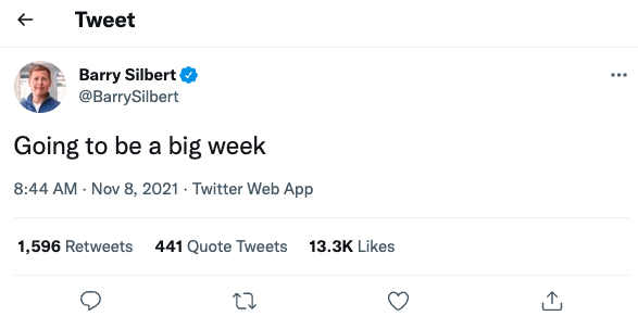 앞서 배리 실버트 CEO는 이날 오전 8시 44분경 "이번 주는 중요한 주(a big week)가 될 것"이라는 트위터 게시글을 올렸고 실버트의 트윗 이후 BTC 가격은 15시 43분 현재까지 5% 이상 상승했다.