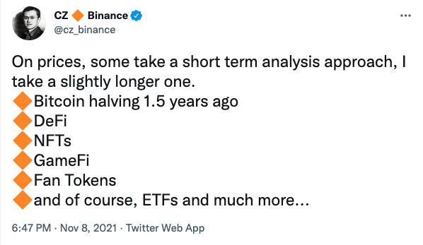 장펑 자오(CZ) 바이낸스 최고경영자(CEO)는 8일 자신의 트위터를 통해 "(비트코인을 비롯한) 가상자산(암호화폐) 가격에 대해 사람들은 단기적으로 분석하지만 나는 좀더 장기적으로 분석하고 있다"고 밝혔다.