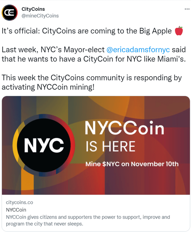 앞서 에릭 애덤스 신임 뉴욕 시장은 "마이애미의 시티코인과 같은 코인을 뉴욕시도 갖기를 원한다"고 말한 바 있다. 이에 시티코인 측이 애덤스 시장에 대해 반응한 것으로 보인다.