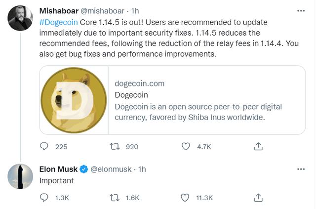 8일 테슬라의 창업주이자 세계 최고 부자인 일론 머스크 최고경영자(CEO)가 도지코인(DOGE)의 최근 업그레이드(1.14.5v)를 알리는 트윗을 통해 "중요하다"고 답했다.